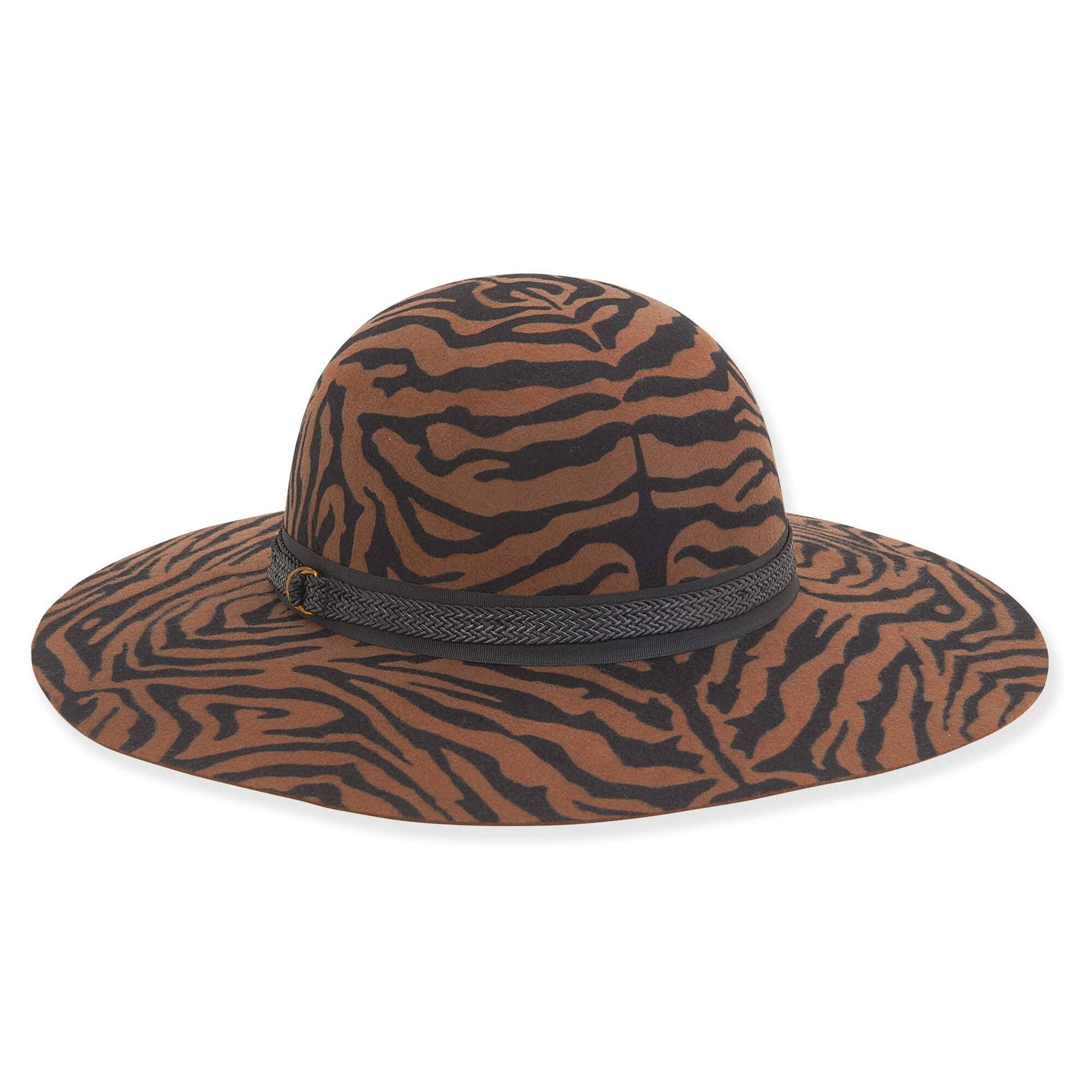 Elevate your accessory game with this striking brown wool felt floppy hat, featuring a bold zebra print that commands attention. The generous 3.75" brim provides excellent sun protection while making a confident style statement. Crafted from quality wool felt, this hat delivers durability and structure that holds its shape through seasons of wear. Perfect for adding edge to casual outfits or layering into more polished looks, this piece bridges the gap between practical headwear and fashion-forward accessory.